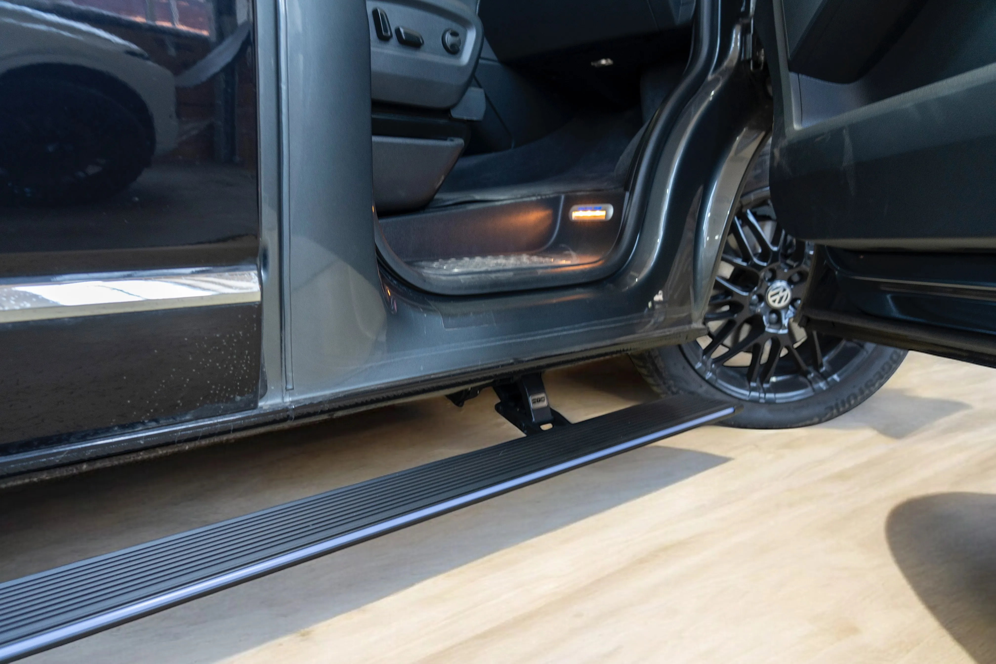 Premium Electric Side Steps // For this luxury SUV build, the Gangsta Paradise automatic running boards serve as the ultimate accessibility upgrade, proving that style and function can coexist seamlessly. Outfitted with integrated LED lighting, these steps were custom-configured at the client's request, who approached us after market options failed to meet both durability and design standards. The goal was to create steps that looked OEM+ while providing superior weather resistance. To complete the transformation, custom rubber tread inserts were added, allowing surefooted entry in all conditions—yes, even mountain terrain. The result is a perfect fusion of utility and urban sophistication.